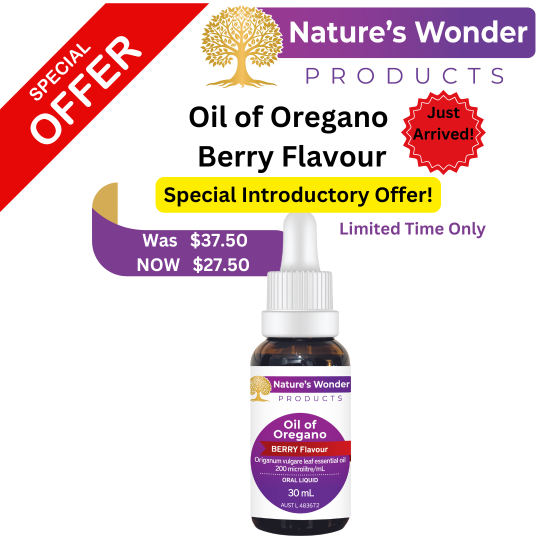 Oil of Oregano Berry Flavour by "Nature's Wonder" uses Wild Harvested, GMO Free Oregano Oil (Origanum vulgare) and has a High Potency with 80% Carvacrol.